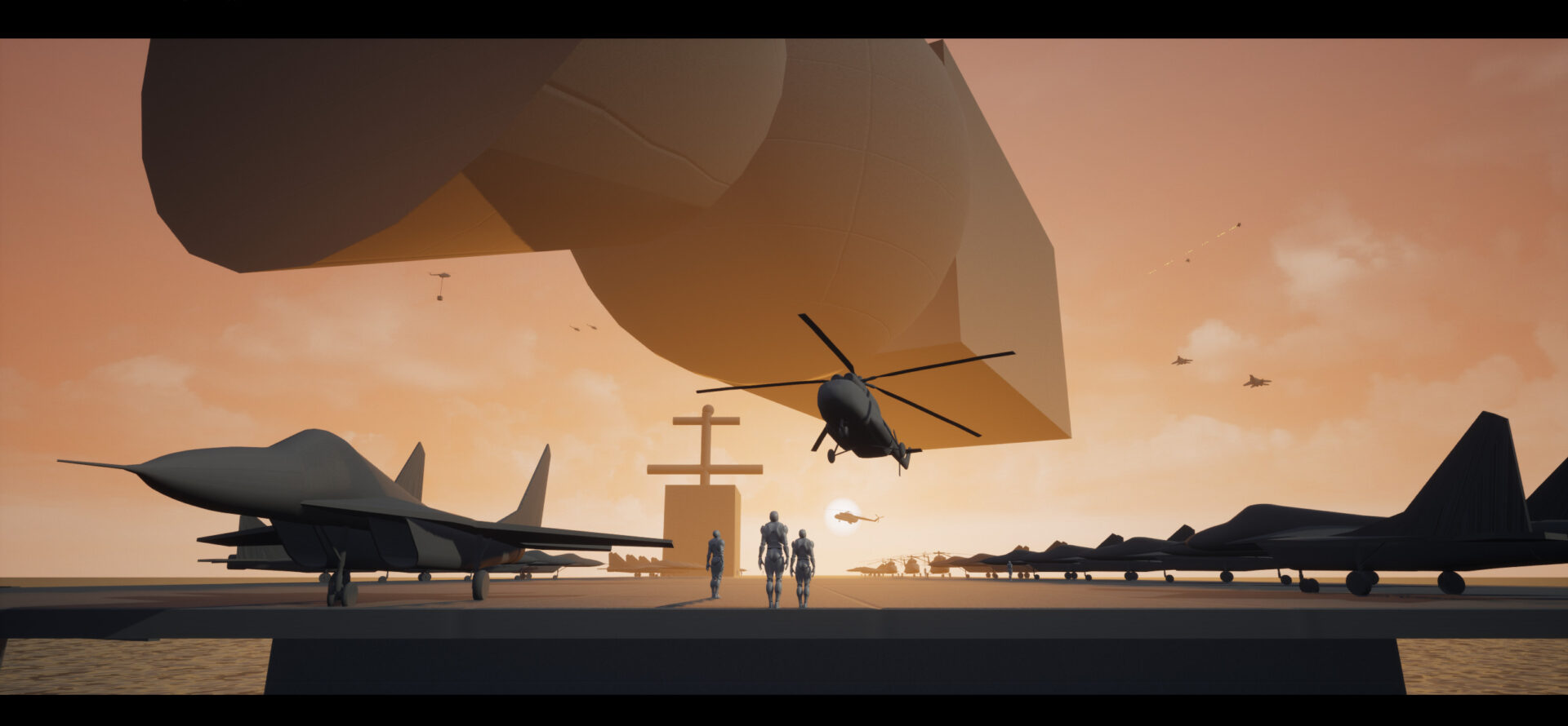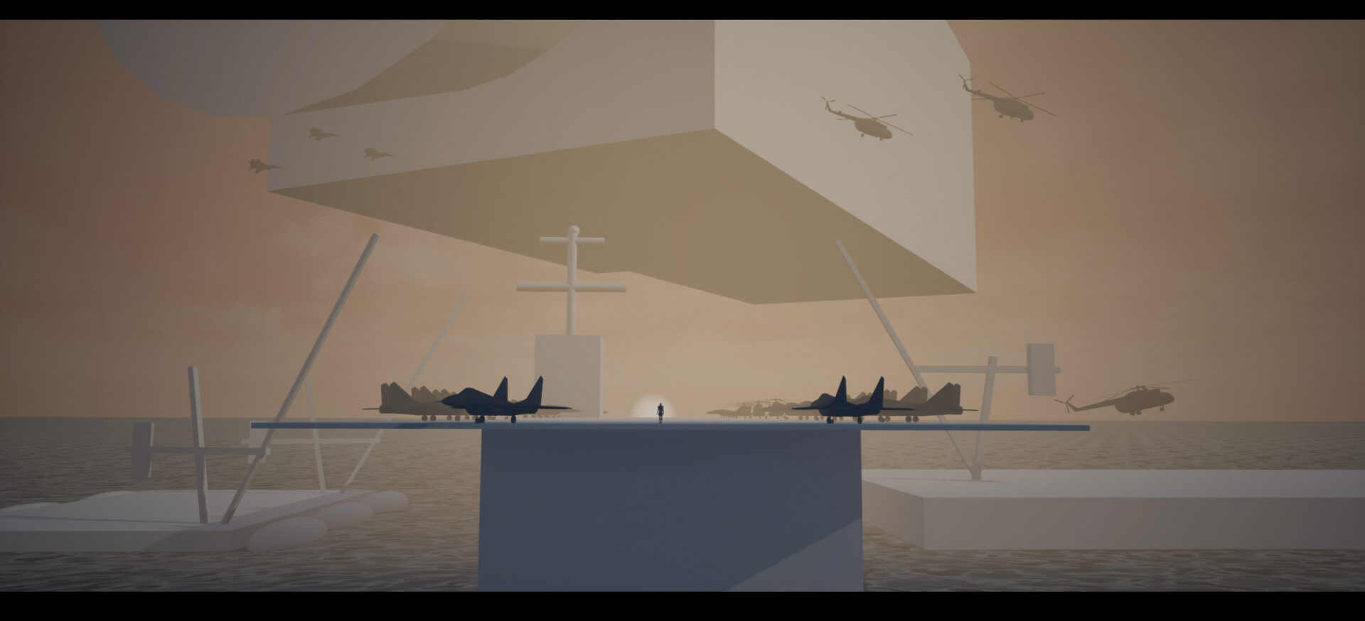Where it currently stands. The fog was crushing my values and therefore my composition. I fixed that, and changed the FOV of my camera as well. The ship was distracting me and clashing with the aircraft carrier, so I simplified for now. I keep moving closer to my main character, and his story continues to evolve. I liked how he used to look, striking and solitary against the Sun. But I found that by adding the child beside him, it is much more evocative for me personally. I begin to wonder about their relationship and their circumstances. I am concerned for the child, and worried about the absent mother. Is this man even the child’s father? I hope I get to find out as I keep working.