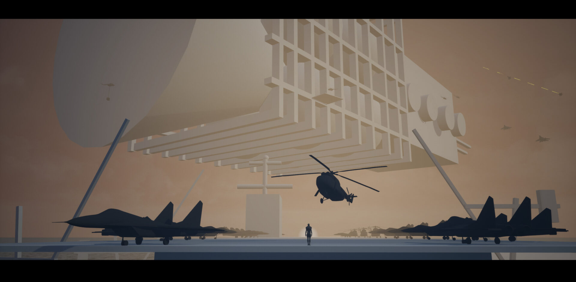 Still getting a feel. Even though it’s literally 3 extruded cubes, the carrier was not looking very good in the first shot. It looks small and unimpressive, and I was making a lot of compositional sacrifices to boot. I thought pulling in much closer would help, but I lose the chance to have the helicopter landing off the ship like in the concept art. This was fortuitous though, because something I have learned from my writer friends is that stories are better when they are focused. Why not have the helicopter front and center, picking up the person on the flight deck. Initially, I put him there only for reference, but now he has become the main character in my visual story that is forming around him. I also added more to my ship to match the reference more closely, but I’m not too worried about the exact geometry since I will create a more complete blockout piece in 3ds max later once I have the concept ironed out.